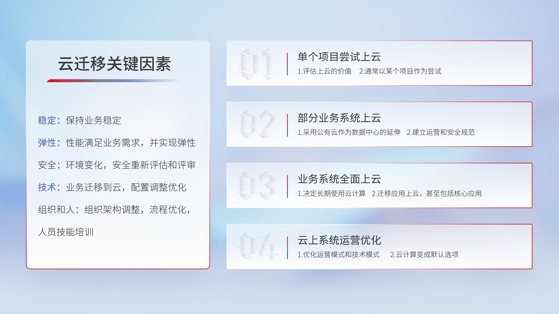 结合实际业务,,从规划设计、、、、云平台选型、、、云原生改造、、数据迁移、、、、集成交付,,,迁移全过程为客户识别最佳上云路径,,做好风险识别管理,,设计网络架构、、身份权限、、安全审计合规、、、、操作审计、、、日志审计、、、、监控告警策略、、、、多站点容灾设计等,,对云上基础设施进行整体规划,,,,提升IT治理水平,,,以满足弹性、、、高可用、、高性能的需求。。。。